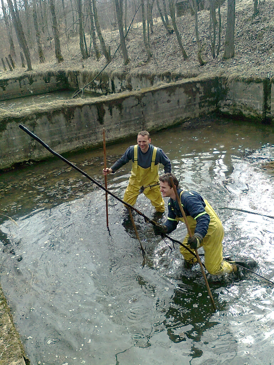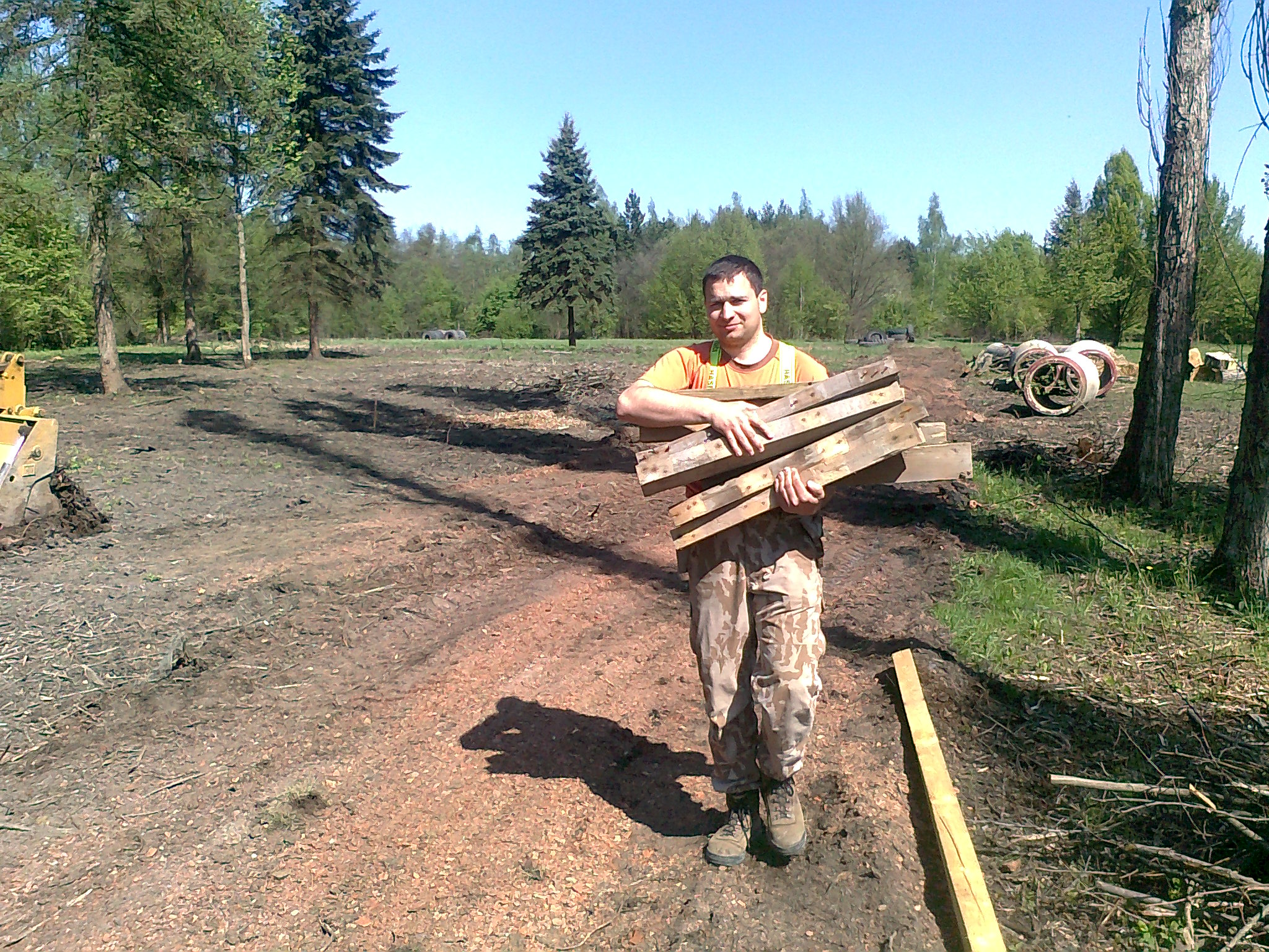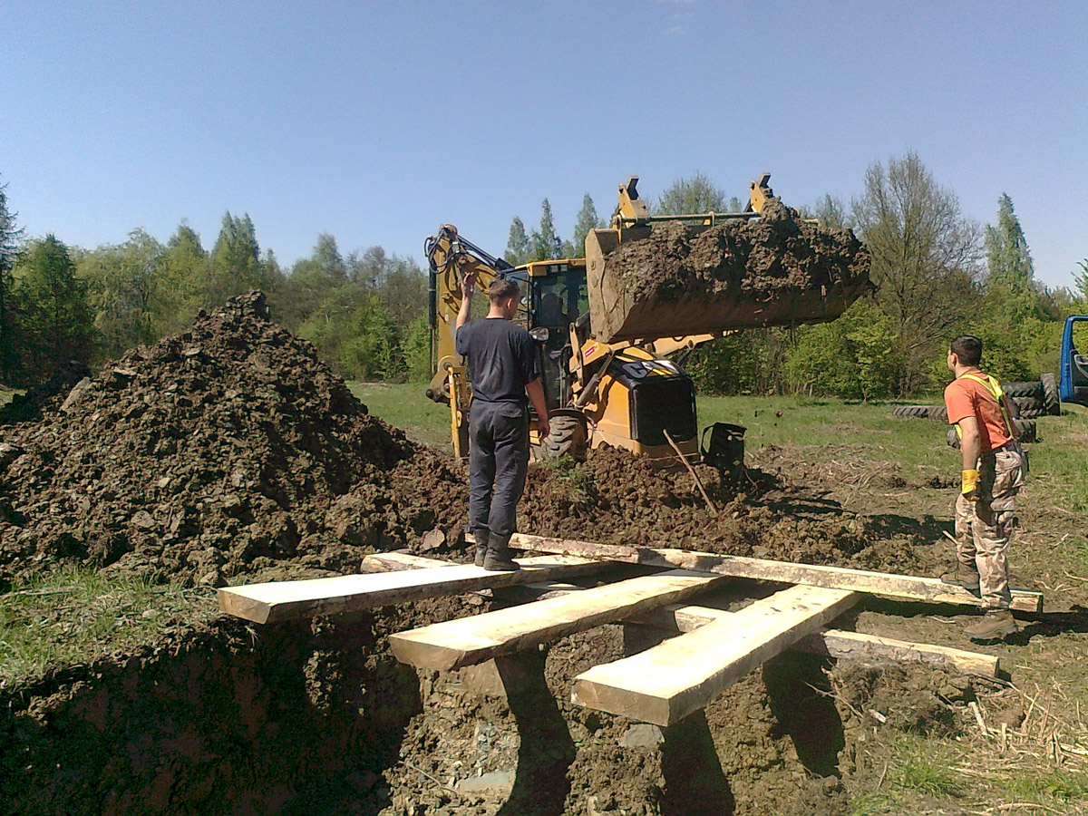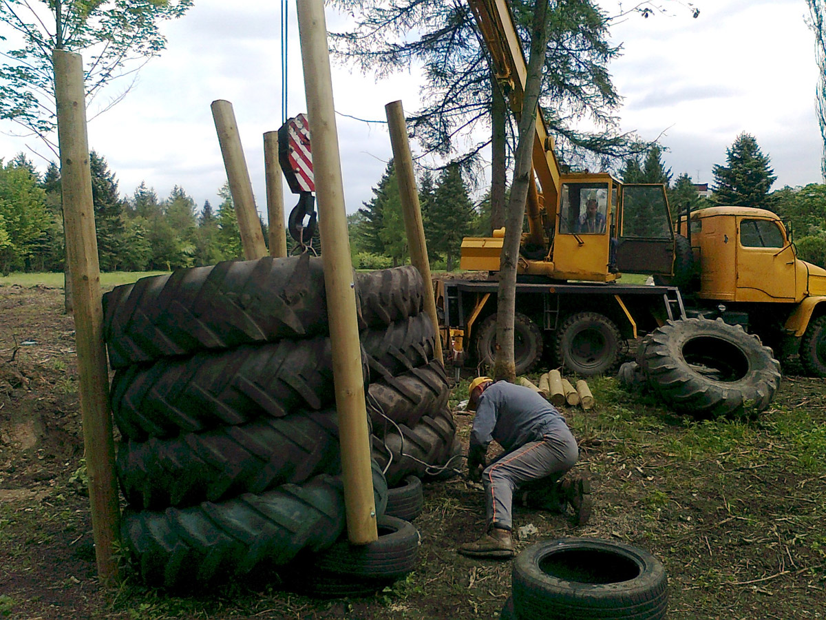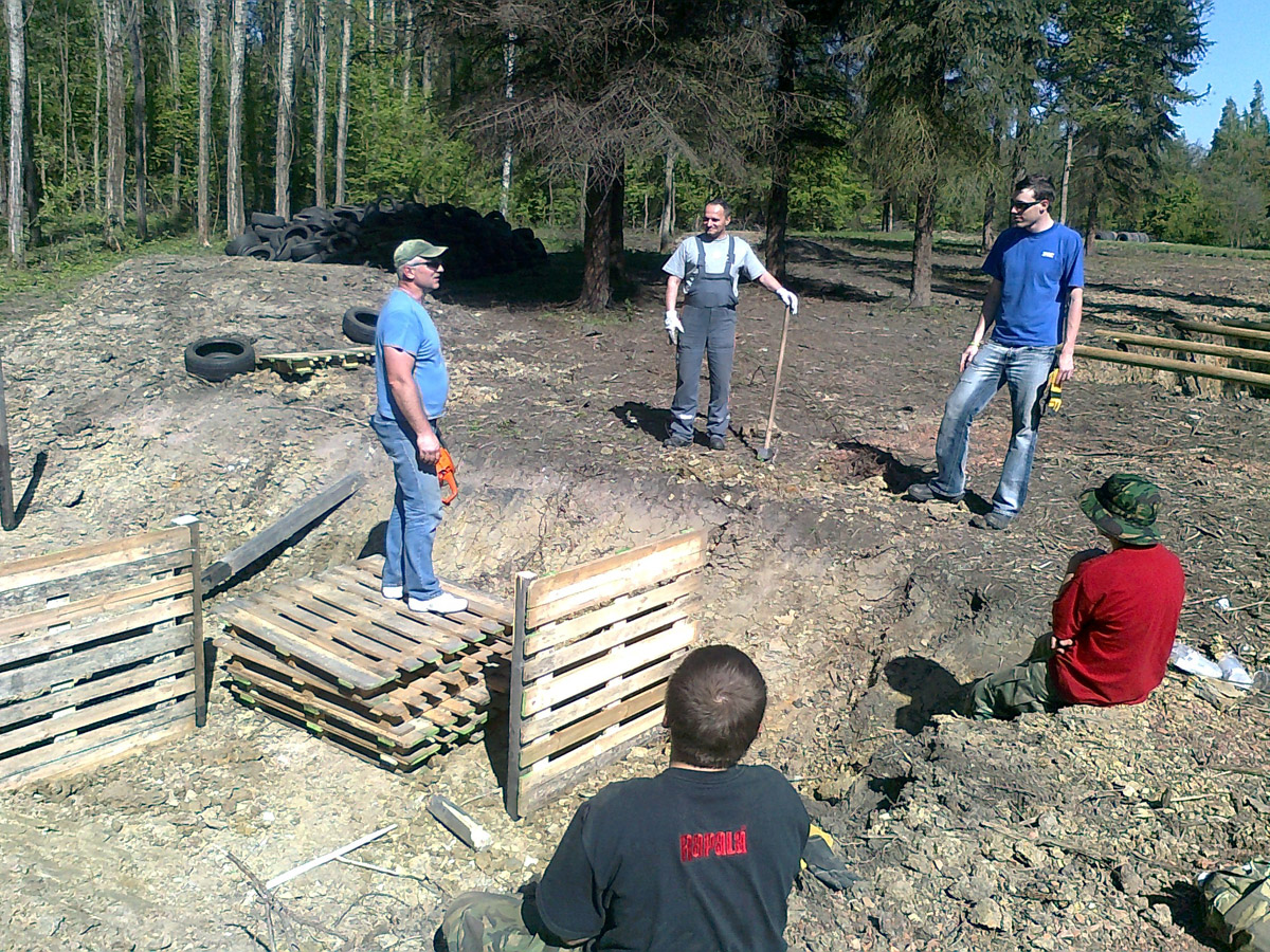 Požádali jsme město o bezplatnou zápůjčku 9 hektarů bývalého lesoparku, tedy původně části lomu Medard zvané Jižní lom. Ten byl při velké povodni v létě 1954 zatopen a následně byla jeho činnost ukončena zavezením navážky. V době zahájení realizace našeho projektu byl pozemek již dlouhou dobu neudržován, místy neprostupný a v podstatě celoročně podmáčený. Pro naše účely tedy bylo nutné pozemek částečně odvodnit a přistoupit k velkoplošnému kácení náletových dřevin. S tím jsme statečně začali mrazivého ledna 2011. Následovalo zpřístupnění pozemku rozšířením a odvodněním příjezdové cesty, následně strojové frézování zbytků náletů a pařezů, vytvoření výkopů, navezení materiálu a postupná instalace jednotlivých překážek.